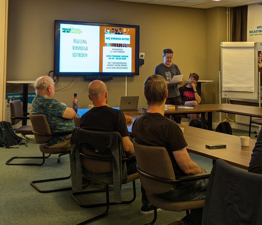 Het was verheugend dat de deelnemers aan de bijeenkomst flink geïnteresseerd bleken te zijn in de campagne voor een beter OV. Meteen na afloop van de bijeenkomst konden al zeven nieuwe mensen worden toegevoegd aan de groepsapp van de Leidse groep. Ook lieten flink wat mensen weten dat ze wilden gaan meedoen met de flyeracties die op 3 en 5 september bij station Leiden Centraal gaan plaatsvinden ter ondersteuning van OV-werkers.