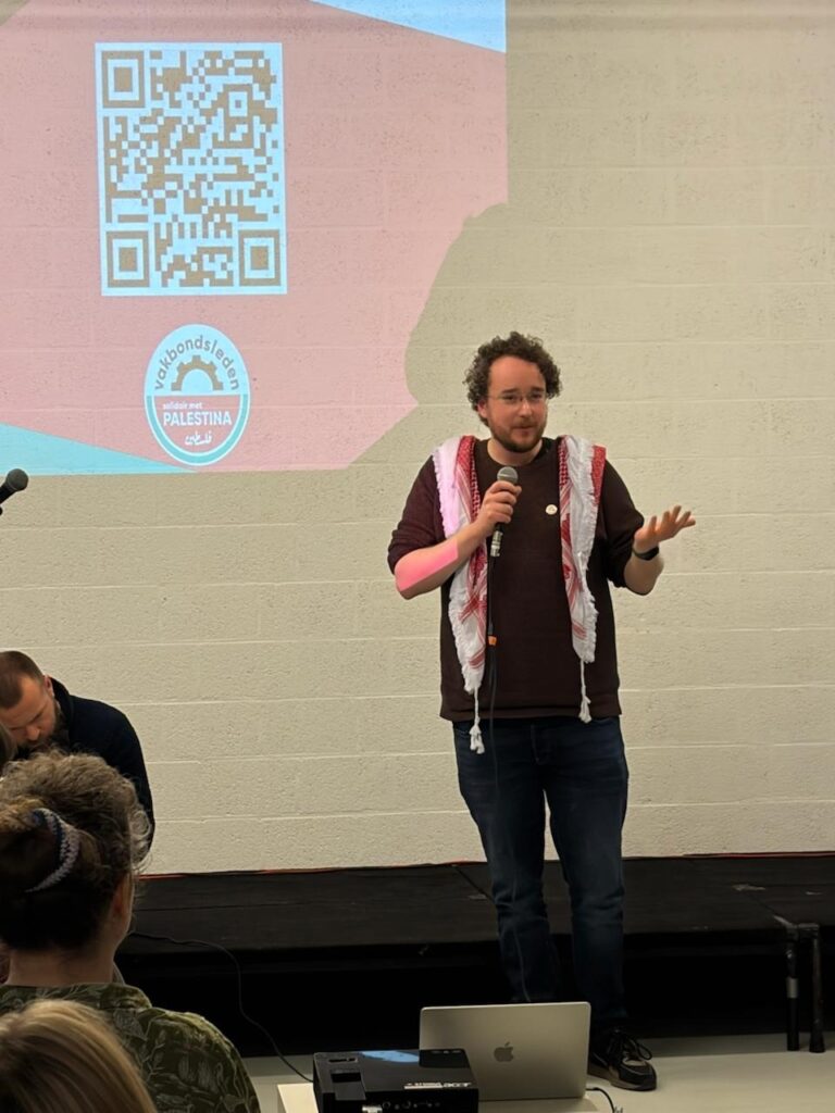 Deze analyse leidde Englert naar het centrale argument van de avond: de noodzaak van organiseren op de werkvloer. Hij merkte op dat Palestijnse vakbonden, via de Workers in Palestine International Campaign, binnen de eerste tien dagen van de genocide in Gaza de internationale vakbeweging opriepen tot actie. Die oproep – om wapenproductie te stoppen, wapentransporten te blokkeren en druk uit te oefenen op medeplichtige bedrijven – is in Nederland en andere westerse landen, op een aantal uitzonderingen na, onvoldoende beantwoord.