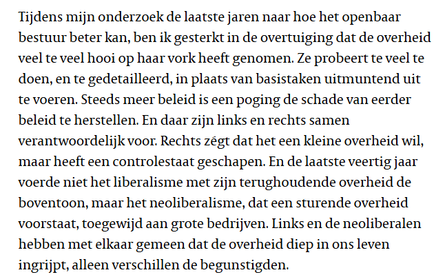 Neem het stuk van Bessems: hij gooit met abstracte termen als een “kleine overheid”, die wenselijk zou zijn. Als je vraagt waarom, komt hij vast met allemaal filosofen en artikelen waarom het “moreel wenselijk” is om een beperkte overheid (en ongebonden kapitalisme) te hebben.