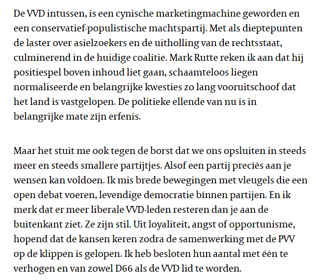 Zo kan Bessems wat krom is, recht lullen, namelijk dat hij lid is geworden van (en geld geeft aan) de VVD, een cynische marketingmachine, een conservatief-populistische machtspartij. Uit “opportunisme”, zegt hij. Een opportunisme dat hij zich kan veroorloven.