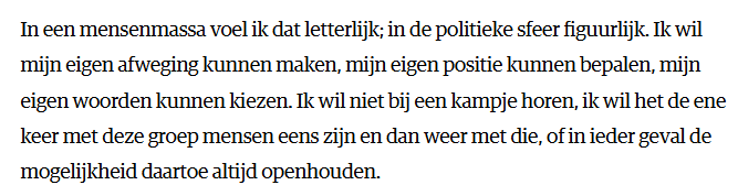 Zonder die huizencrisis was ik nu misschien wel een liberaal geweest. Maar oplettendheid is geboden. Sommige hoofdarbeiders spreken revolutionaire taal, maar willen uiteindelijk toch gewoon een comfortabel mediabaantje hebben. Daar moet je voor uitkijken.