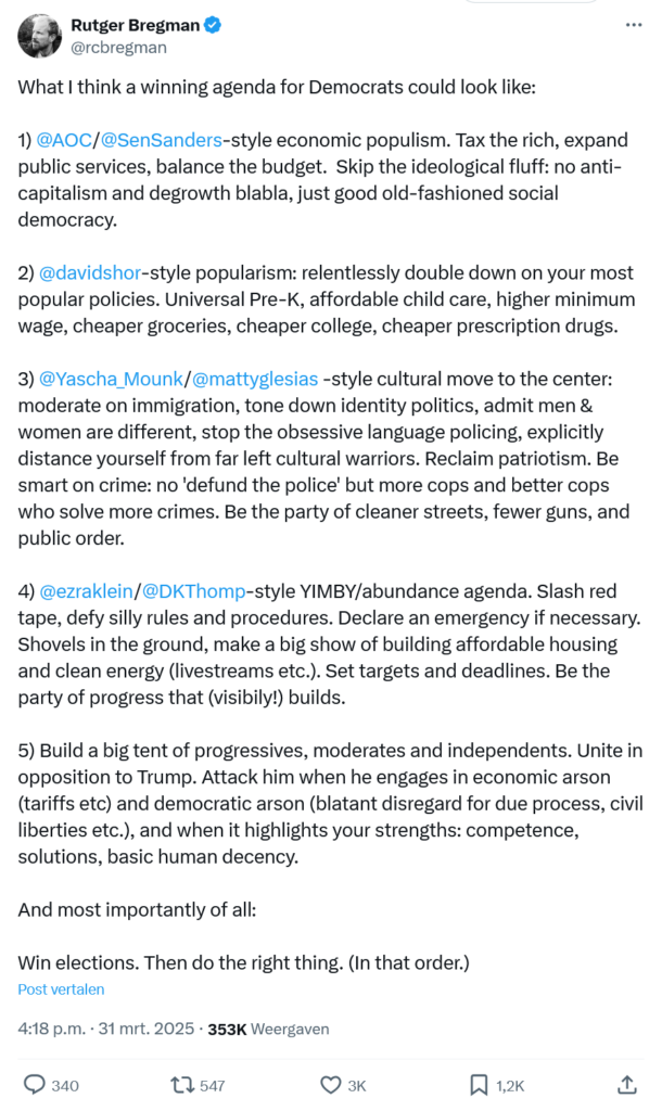Het is dan ook niet verrassend dat Bregman ook de politiek kapot heeft geabstraheerd. Het gaat alleen nog om het winnen van verkiezingen, stelt hij, niet meer om de inhoud. Mijn vraag: waarom maakt het dan uit wie verkiezingen wint?