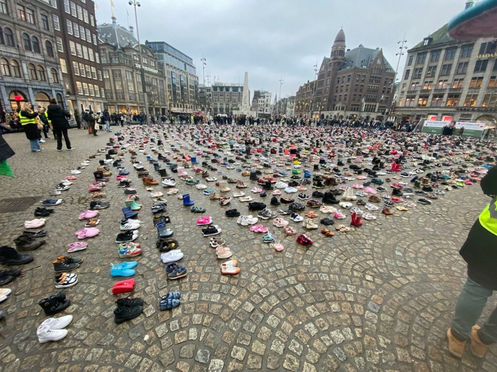 Duizenden kinderschoentjes op de Dam, afgelopen zaterdag. Ze symboliseren de door Israël in Gaza vermoorde kinderen.