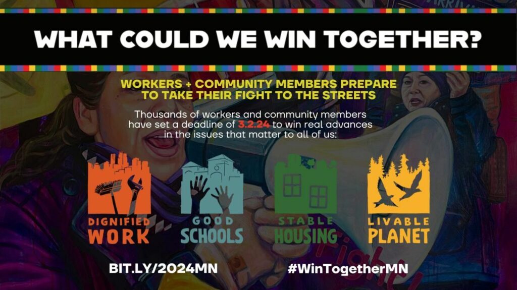Local 26 is slechts een van de vele vakbonden en maatschappelijke organisaties in Minneapolis en St. Paul die hun onderhandelingen voor nieuwe contracten – en, in sommige gevallen, stemmingen over stakingen – hebben afgestemd op een deadline van 2 maart. Die datum is bewust gekozen om hun invloed te maximaliseren en gezamenlijk vastgestelde gemeenschapseisen binnen te halen op vier belangrijke gebieden: waardig werk, stabiele huisvesting, een leefbare planeet en goede scholen.