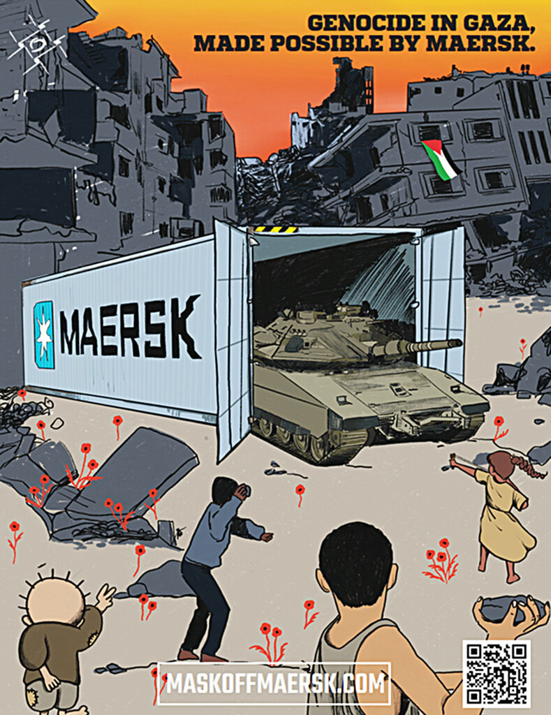 Na twee jaar van onderzoek en directe actie bereikte de Palestinian Youth Movement (PYM, Palestijnse Jongerenbeweging) eind juni tot haar grote vreugde een mijlpaal. De Deense containervervoergigant Maersk maakte bekend niet langer met bedrijven samen te werken die actief zijn in illegale Israëlische nederzettingen. Met haar campagne Mask Off Maersk wist de PYM de medeplichtigheid aan de genocide in Gaza aan te tonen van de multinational A.P. Møller – Maersk A/S. Het bedrijf bleek wapentransporten te verzorgen voor het Israëlische leger, zoals bijvoorbeeld het vervoer van belangrijke onderdelen voor de F35-gevechtsvliegtuigen die Israël gebruikt om de bevolking van Gaza te bombarderen. Als onderdeel van de Boycott, Divestment, Sanction-beweging organiseerde de PYM vervolgens een serie acties. Uiteindelijk wist zij voldoende druk op Maersk uit te oefenen om zijn beleid te veranderen.