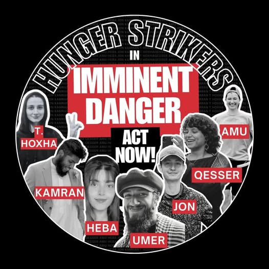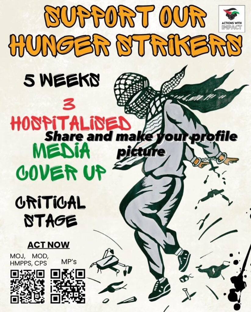 Zeven mensen, die allemaal in voorlopige hechtenis zitten in afwachting van hun proces omdat ze zouden hebben geprotesteerd uit solidariteit met Palestina, zijn in hongerstaking in Britse gevangenissen. Hun namen zijn Qesser Zuhrah, Amu Gib, Heba Muraisi, Jon Cink, T Hoxha, Kamran Ahmed en Muhammad Umer Khalid. Een achtste gevangene, Lewie Chiaramello, die diabetes heeft, voert ook een gedeeltelijke hongerstaking en weigert om de dag eten, wat een ernstig risico voor zijn gezondheid vormt. Vandaag is het veertig dagen geleden dat Qesser en Amu, die op 2 november, de 108e verjaardag van de Balfour-verklaring, met hun hongerstaking begonnen, voor het laatst hebben gegeten. Hun lichamen worden zwakker – vijf stakers zijn al in het ziekenhuis opgenomen – maar hun vastberadenheid blijft onverminderd: de stakers verklaren dat ze zullen blijven weigeren te eten totdat de Britse regering aan hun vijf eisen voldoet.