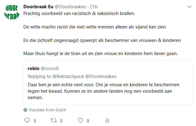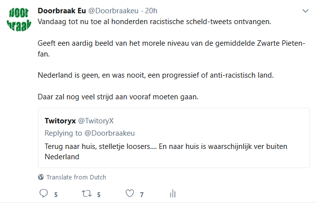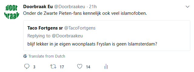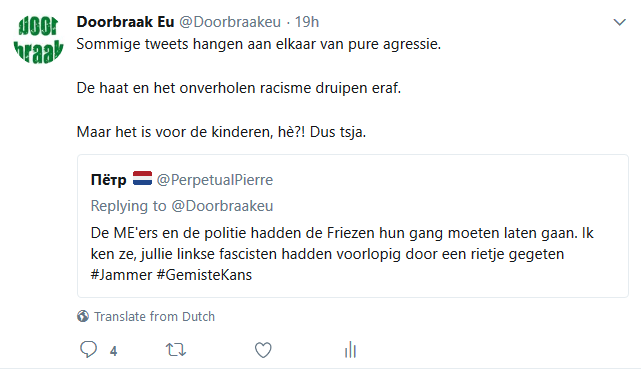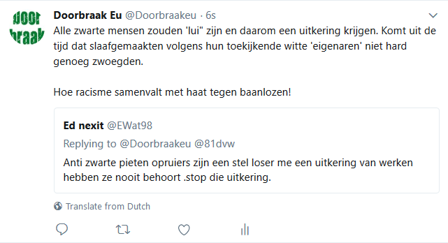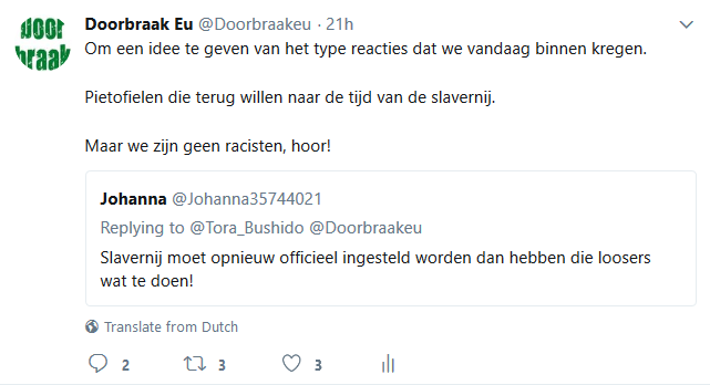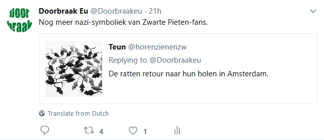 Met name naar aanleiding van de gebeurtenissen met de racistische wegpiraten in Friesland hebben de racisten er nog een schepje bovenop gedaan en ontvingen we gisteren en vandaag opnieuw honderden en honderden haat-, scheld- en soms zelfs dreigtweets, die tezamen weer duizenden keren geretweet werden. Een waterval aan tweets die de psyche, de mentaliteit en het gedachtegoed van racistisch Nederland genadeloos blootlegt. Moesten onderzoekers dertig jaar geleden nog in obscure blaadjes op zoek naar openlijk extreem-rechtse uitingen, vandaag leveren de racisten ze zomaar gratis af in je Twitter-timeline. We pikten er wat tweets uit die representatief zijn voor de hele berg en voorzagen die van ons commentaar (dat er steeds boven staat). Dat leidde vanzelfsprekend tot nog meer haat-tweets, maar toch ook tot her en der de verwijdering van een tweet door iemand die schrok van zichzelf of zich plots realiseerde dat openlijk racisme strafrechtelijke consequenties kan hebben.