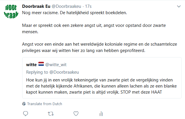 Ja, schokkend, de bagger die huist onder de schedel ProPietGriezels! Dat alleen al zou reden genoeg moeten zijn voor anderen om in ieder geval afstand te nemen van de eis van dergelijke fanaten dat piet pik- en pikzwart zal zijn! En te beseffen hoeveel racisme en fascisme er schuilt onder die valse verdedigers van de kinderziel. Je zult je kinderen maar in de buurt van dit soort doodenge mensen op moeten laten groeien!
