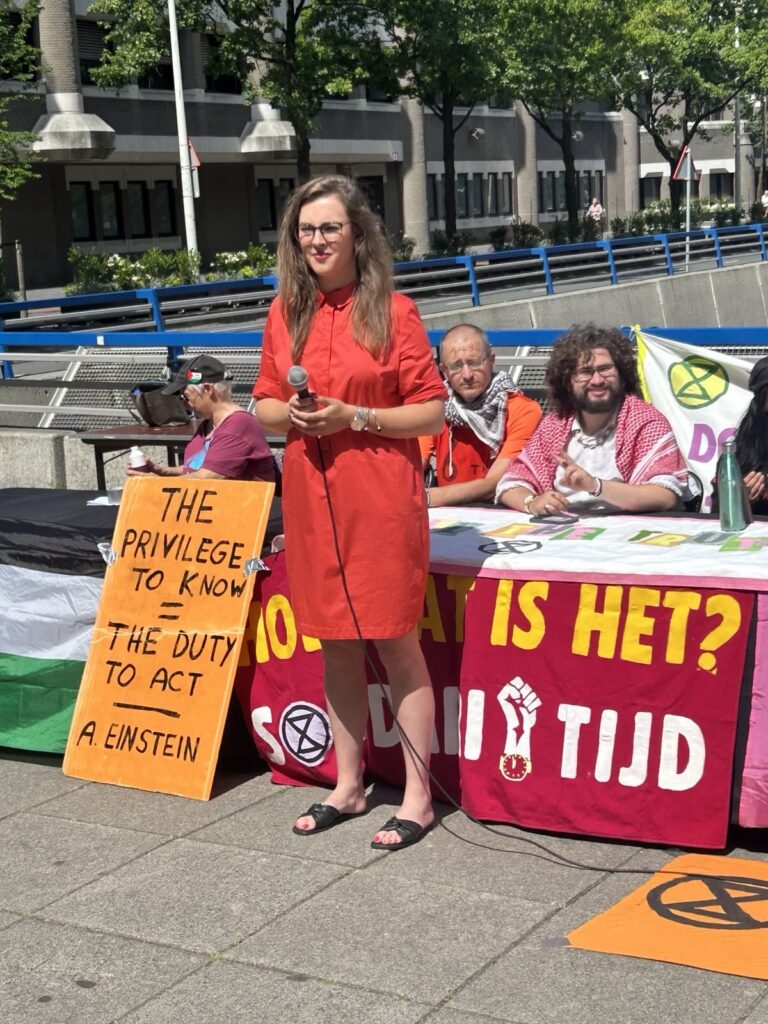 Additionally, in the Netherlands alone 40 billion euro per year is handed out to large corporations to stimulate the use of fossil fuels rather than to stimulate the energy transition. Forty billion! One billion would be 50 euro per Dutch citizen. [Takes out 50 euro bill] Forty billion per year amounts to 2.000 euro per person. [Takes out 2.000 euro] Every year! Not just in the Netherlands, but in many places, a large chunk of the taxes we pay is given to oligarchs and fossil industries. We demand from our government to finally take science seriously and stop fossil subsidies. Use my 2.000 euros wisely and everyone else’s too! Finally, I urge the mayor of the Hague to show how democracy can grow stronger by facilitating peaceful protests rather than hurting democracy by discrediting them.