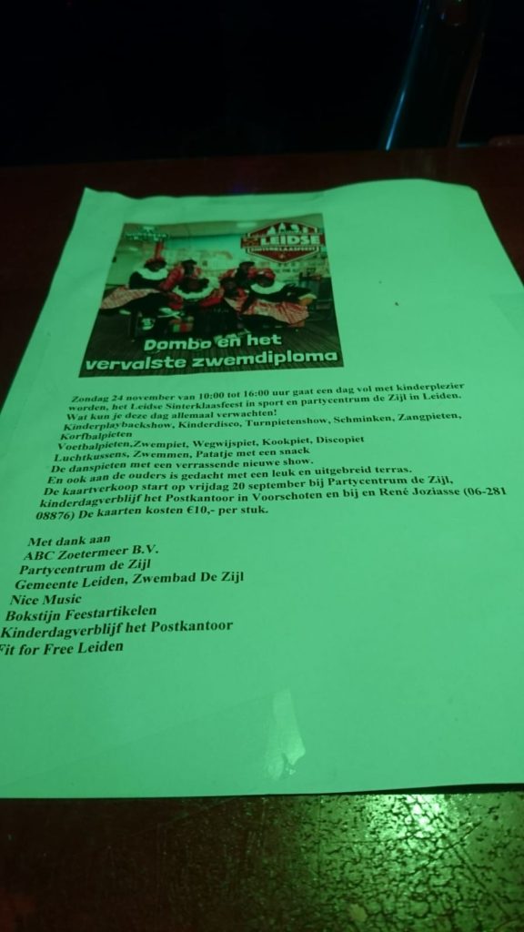 Op zondag 24 november van 10:00 tot 16:00 uur dreigt de racistische karikatuur Zwarte Piet volop te worden gepromoot in sport- en partycentrum De Zijl aan de Paramaribostraat 66 in Leiden. Die dag organiseert het partycentrum een Sinterklaasfeest met het thema “Dombo en het vervalste zwemdiploma”, en “met dank aan de gemeente Leiden”, zoals de organisatoren melden op een flyer vol blackface-racisme. Maar die gemeente heeft toch beloofd om Zwarte Piet in 2019 helemaal af te schaffen?