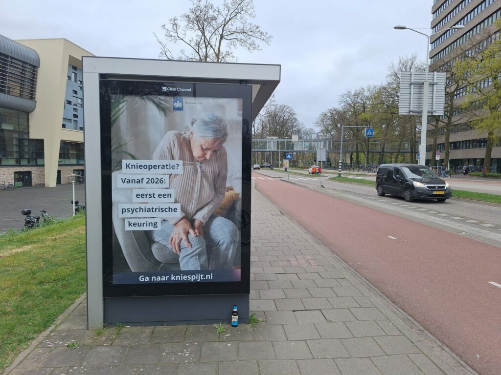 “Knieoperatie? Vanaf 2026: eerst een psychiatrische keuring”, dat is te lezen op posters in bushokjes en langs wegen. Het gaat gelukkig niet om echte rijksoverheid-posters, maar om een campagne van Trans Zorg Nu. De actiegroep vraagt via kunst en satire aandacht voor hoe absurd transitiezorg voor transgender personen in Nederland is ingericht. Trans personen die transitiezorg nodig hebben, moeten in Nederland namelijk wel door een psychologische keuring: een langdradig en vernederend diagnoseproces dat ook nog eens een van de belangrijkste redenen is voor de jarenlange wachtlijsten. Ranja Bender van Trans Zorg Nu licht de posteractie toe. “Bij een knieoperatie klinkt het idee van een psychologische keuring absurd. We vinden het logisch dat iemand die beschikt over alle relevante informatie, zelf een beslissing kan maken over een medische ingreep. Ook al heeft 1 op de 16 spijt van een knieoperatie. Bij transitiezorg heeft minder dan 1 op de 100 mensen spijt van een medische ingreep. Toch moeten trans personen uitgebreide psychologische tests doorlopen om toegang te krijgen tot genderbevestigende zorg.” Trans Zorg Nu wil af van dit poortwachterssysteem. “Wij kunnen als trans mensen zelf beslissen over ons lichaam. We hebben geen vreemde derde partij nodig die bepaalt of we ’trans genoeg’ zijn.” De groep vindt dat niet alleen trans volwassenen, maar ook trans jongeren autonomie moeten hebben over hun eigen lichaam. Ze pleit ervoor dat zij de juiste hormonen krijgen om de puberteit te ervaren die bij hen past, in plaats van hun leven jarenlang op pauze te zetten. “We eisen menselijke genderzorg waar ieders eigen behoeften en zelfbeschikking centraal staan. Waarin we zelf kunnen beslissen over ons leven.” Met deze posters trapt de groep een grotere campagne af onder de titel “Genderdiagnonsens”. Op genderdiagnonsens.nl zijn al enkele kunstwerken te vinden die via satire de problemen in de transgenderzorg aankaarten. Bijvoorbeeld een ganzenbordspel – “het meest deprimerende spel van Nederland” – waarin je als speler de uitdagingen van het zorgproces moet overwinnen. Creatievelingen worden ook opgeroepen zelf kunst bij te dragen. Op 12 mei zal een deel van de werken worden tentoongesteld in De Sering in Amsterdam.