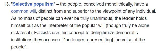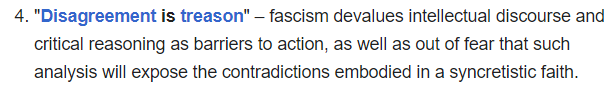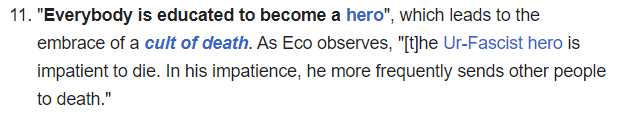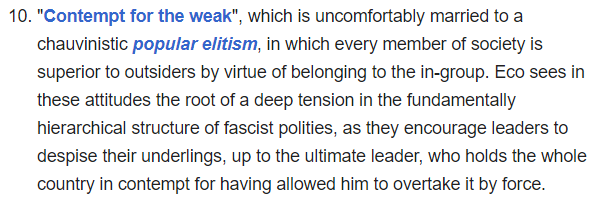 We doen dit langs de lens van het ur-fascisme van Umberto Eco. Eco leefde ten tijde van het Italiaanse fascisme, en in zijn werk maakt hij fascisme goed los van de tijdelijke en plaatselijke componenten. Nou, dat waren de disclaimers.
