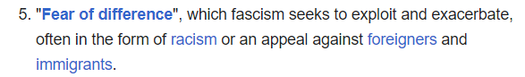 Angst voor verschillen… moet ik deze uitleggen? Fascisten zijn racisten die migratie willen inperken en die alles dat buitenlands is inherent niet vertrouwen. Dit geldt niet alleen voor racisme, maar ook voor andere vormen van discriminatie, zoals homofobie.