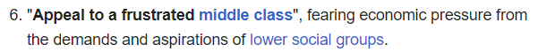 De gefrustreerde middenklasse aanspreken. Veel fascistische partijen spreken niet de mensen aan die het economisch het slechtst hebben, maar vooral de middenklasse; de mensen die veel te verliezen hebben als links aan de macht zou komen. Daarom wakkeren ze angst voor links aan.