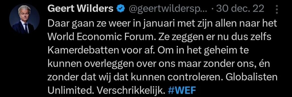 Hoewel het World Economic Forum (WEF) een punt lijkt van Forum voor Democratie, gaat ook de PVV ermee vandoor. De angst is dat het WEF allemaal geheime plannen smeedt om de Nederlandse democratie af te schaffen. Een ander voorbeeld van een complot is dat linkse politici migratie toestaan om Nederland te verzwakken.