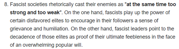 De vijand is zowel zwak als sterk. Fascisten zetten hun vijanden vaak neer als zwak en sterk tegelijkertijd: sterk omdat ze alles verpesten (zo nodig met een complot), maar ook zwak omdat ze incompetent zijn, en daarmee makkelijk te verslaan. Het is in feite een machtsfantasie.