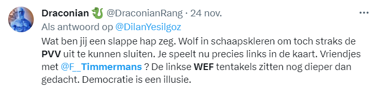 Ook hier voorbeelden te over, maar Timmermans is een favoriet doelwit: hij is een idioot die niet weet waar hij het over heeft, maar hij is ook onderdeel van de WEF-tentakels die overal zitten. Zowel deel van een complot als geheel incompetent.