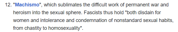 Machismo, ofwel toxische mannelijkheid. De fascist definieert kracht als mannelijk, en zwakte als vrouwelijk. Fascisten hebben daarom een hekel aan wat ze zien als “ontmannelijking”. Denk aan homoseksualiteit of transidentiteit.