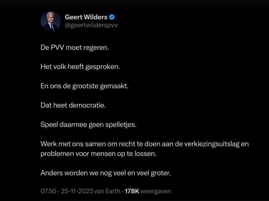Bijvoorbeeld: de PVV is de grootste, dus dat is democratie. Voor de voetnoot dat het slechts 24 procent van de stemmen vertegenwoordigt is geen plaats. Tussen verschillende migranten wordt geen onderscheid gemaakt: het zijn allemaal buitenlanders. Wegblokkeerders zijn terroristen.