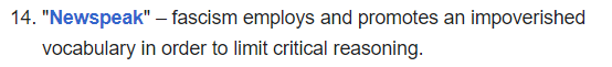 En dan als laatste: newspeak. Fascisten gebruiken geen genuanceerde taal, maar versimpelde taal die het moeilijk maakt om kritisch over onderwerpen te praten. Belangrijke nuances raken verloren en maken plaats voor algemene termen.