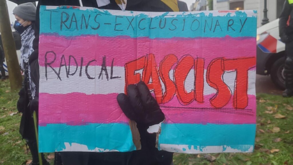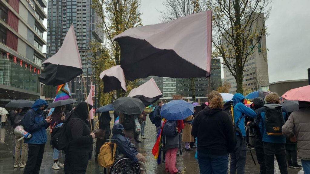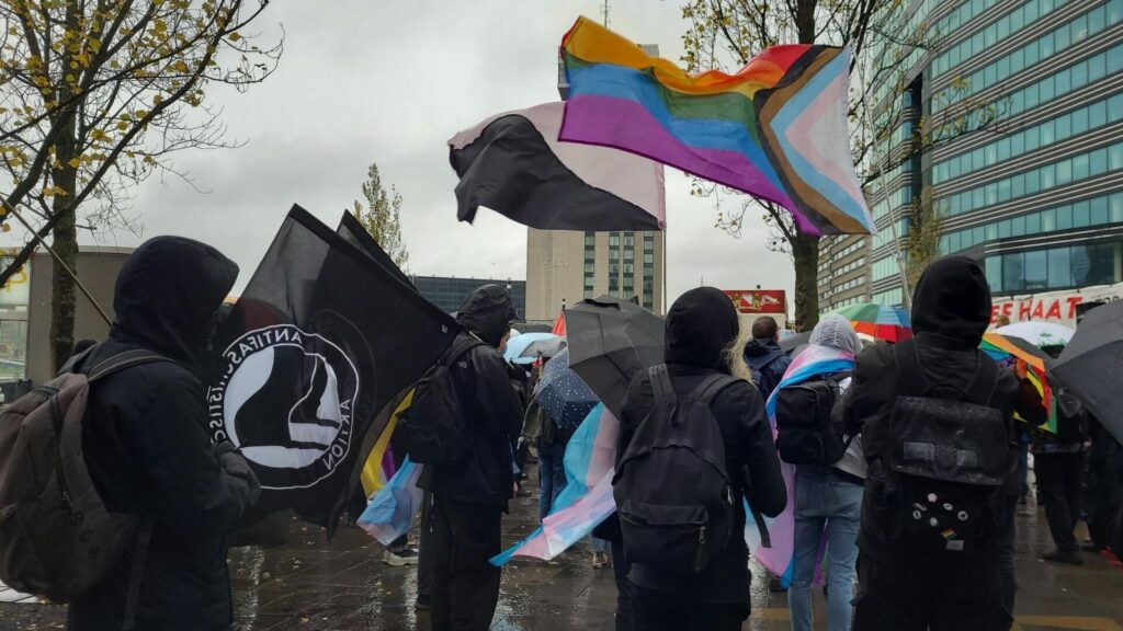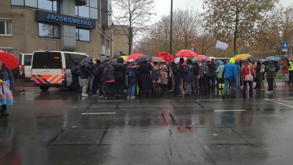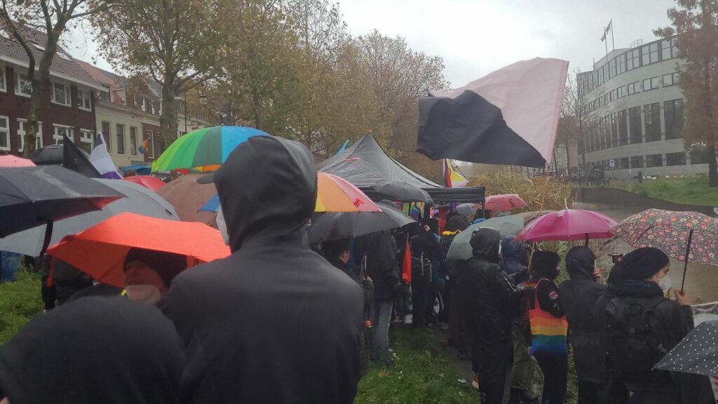 Gisteren vonden er in Utrecht twee protestacties plaats tegen een bijeenkomst van de trans haters van Voorzij en hun extreem-rechtse vrienden. Meer dan honderd mensen met spandoeken, vlaggen en borden namen deel aan de acties, waarmee ze veruit in de meerderheid waren ten opzichte van de terfs (trans-exclusionary radical feminists) die zich verscholen in een tent in het park Paardenveld. Ondanks de aanhoudende regen en ondanks de forse tegenwerking van de politie slaagden strijdbare queers en hun solidaire bondgenoten erin om een krachtig en inspirerend tegengeluid te laten horen.