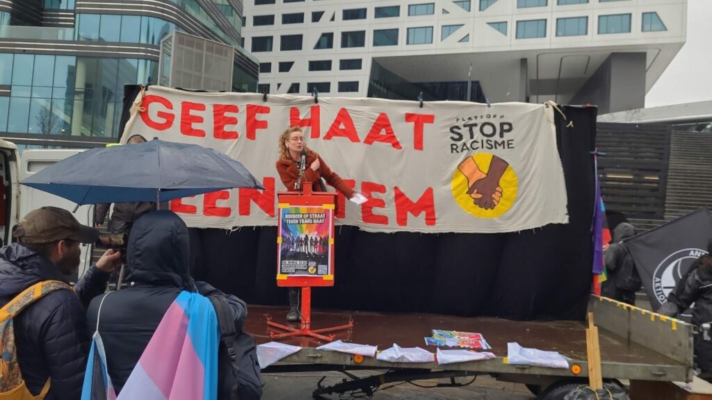 Het protest begon om 12:30 uur op het Jaarbeursplein, meteen naast station Utrecht Centraal. Daar had het Platform Stop Racisme (PSR) de manifestatie “Iedereen op straat tegen trans haat” georganiseerd, waar een kleurrijke en diverse groep mensen uit vooral de lhbtia+ gemeenschap aan meedeed. De Internationale Socialisten hadden actieborden meegenomen die aan duidelijkheid niets te wensen overlieten, met teksten als “Queer power, black power, women power, all power to the working class”. Er waren speeches van queer mensen, en daarbij werd ook het verband gelegd met de strijd voor dekolonisering en voor een vrij Palestina.