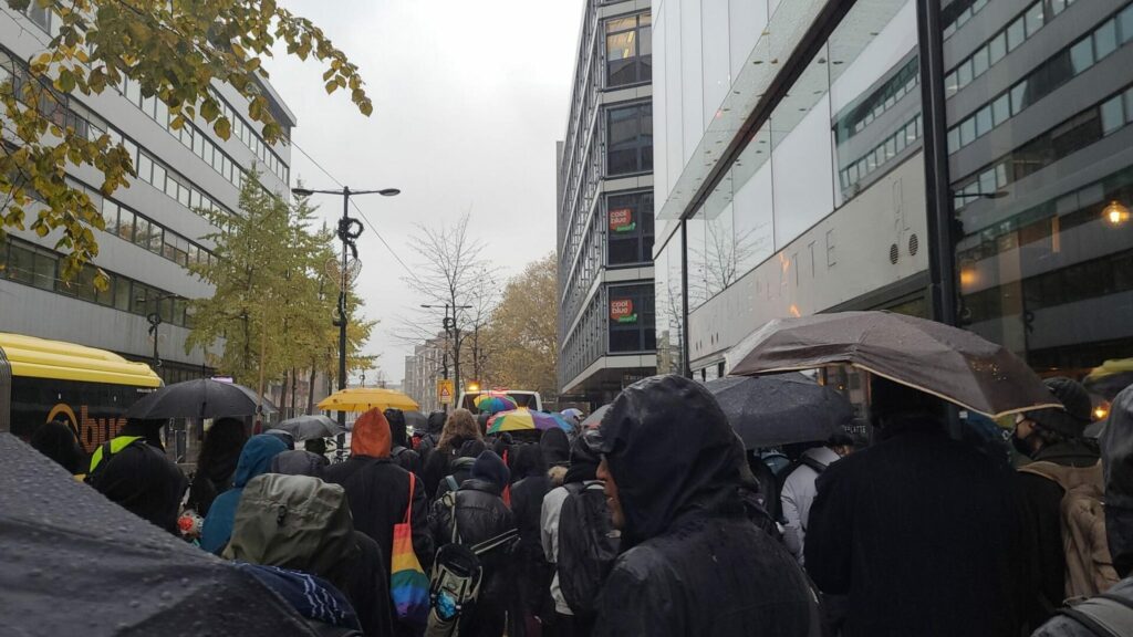Inmiddels waren we vanwege de regen kletsnat geworden, maar dat mocht de actiepret en de strijdbaarheid niet drukken. De energie spatte er vanaf en onophoudelijk werden er leuzen geroepen, zoals “Liefde boven haat!”, “Trans recht mensenrecht”, “Het is stil aan de overkant”, “Terfers gaan naar huis!”, “Jullie kinderen worden net als wij!”, “Een, twee, drie, vier, we willen geen fascisten hier, vijf, zes, zeven, acht, gooi die nazi’s in de gracht”, “What do we want? Trans rights! When do we want it? Now!” Nog steeds waren we omringd door veel agenten en in totaal misschien wel twaalf politiebusjes. Nadat een aantal demonstranten al was vertrokken, omdat ze volkomen verkleumd waren door de weersomstandigheden, moest de politie toch nog zijn gram halen, zoals wel vaker. Een van ons werd opgepakt, waarschijnlijk uit frustratie omdat de politie ons recht op demonstreren uiteindelijk toch niet voldoende had weten te schenden en had moeten toestaan dat wij met enorm kabaal de terfs hadden weten dwars te zitten. Opnieuw werd de terfhaat overstemd door de kleurrijke en energieke queer-beweging.