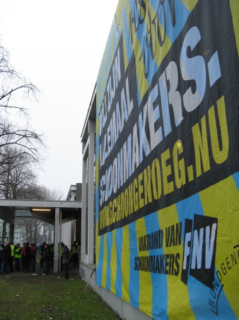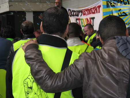 In de collegezaal.In een collegezaal volgden 150 schoonmakers colleges over hoe samen te strijden, over duurzame en sociale economie en over migratie. Willem Bos van SAP/Grenzeloos zette de oorzaken van de crisis uiteen. Maina van der Zwan van de IS vertelde dat er geld genoeg is bij de rijken en dat bezuinigingen op de onderkant van de samenleving niet nodig zijn. Samen de strijd aangaan met de leraren in actie zou een goed begin zijn. Jeroen Breekveldt van Doorbraak gaf aan dat samen strijden betekent dat we ons niet tegen elkaar moeten laten uitspelen. “De politiek zegt dat het je eigen schuld is als je arm bent, als je werkloos bent. Na de vorige sprekers weten we wel beter. Toch probeert bijvoorbeeld minister Kamp werklozen als lui neer te zetten en hij hoopt dat veel mensen werklozen de schuld gaan geven van de economische malaise. Werklozen worden nu in steeds meer gemeenten verplicht te werk gesteld, maar zonder loon. Ze moeten werken, maar alleen voor een uitkering. Ook schoonmaakwerk. Dat gaat schoonmakers banen kosten. Straks worden sommigen van jullie werkloos en als je dan in de bijstand komt, dan kun je weer aan de slag als schoonmaker, alleen nu zonder loon!” Ron Buijs van de Vrije Bond begon met lovende woorden over de staking en stakers, en ging verder door te zeggen dat solidariteit tussen de verschillende groepen die ontzettend veel last hebben van de crisis belangrijk is. Ten tijde van een crisis krijgen juist deze mensen, die aan de onderkant van de samenleving bungelen, te maken met bezuinigingen en nationalistische retoriek. Hij wees op de acties van de Somalische vluchtelingen in Ter Apel en hoe belangrijk het steunen van dit soort initiatieven is.