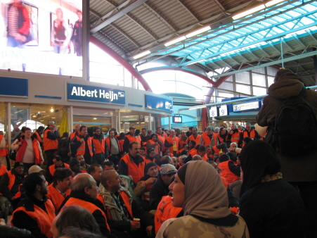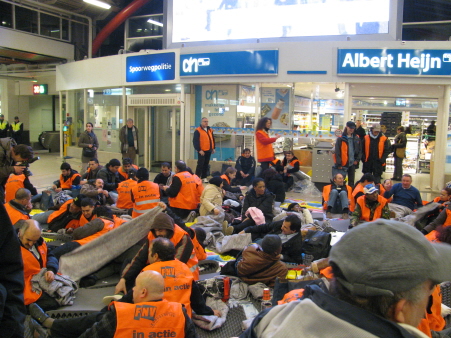 De schoonmakers worden steeds strijdvaardiger. Mochten ze in februari niet in Amsterdam CS demonstreren, begin maart trokken ze met honderden door Utrecht CS en nu blijven ze zelfs slapen op dit station.