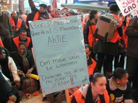 Vanaf 16:00 uur verzamelden zich honderden schoonmakers op Utrecht CS met een ontzettend enthousiasme om hun eisen te bereiken. Ze eisen onder meer een loonsverhoging van drie procent, een reiskostenvergoeding, betere werkomstandigheden en betere opleidingen. De sfeer was uitstekend met honderden schoonmakers, afkomstig uit alle windstreken, die uren bleven scanderen en muziek maken.