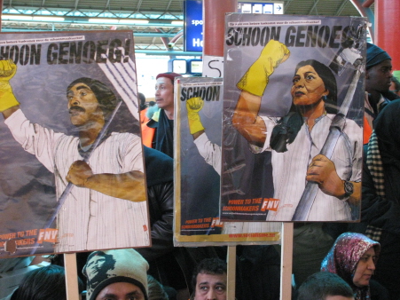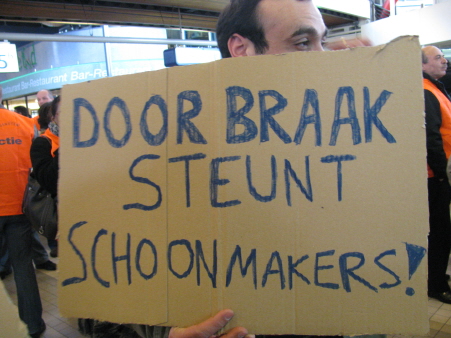 Daarbij waren er van diverse linkse groepen mensen aanwezig: Doorbraak, Vrije Bond, AFA, IS en kritische studenten. Bijna iedereen had de uitgedeelde "FNV in actie"-hesjes aangetrokken. Ook de SP was aanwezig en deelde eigen pamfletten aan de reizigers uit, en stroopwafels aan de schoonmakers. Hun nieuwe voorman Emile Roemer hield een toespraak. Door de slechte megafoon was die helaas niet voor iedereen goed te verstaan – en dat gold eveneens voor de toespraakjes van de Vrije Bond en Doorbraak.