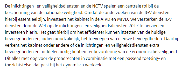 Zo krijgen de NCTV, de AIVD en de MIVD in ieder geval meer middelen, maar wordt ook het wettelijk kader “herzien”. Daarbij krijgen ze meer surveillancebevoegdheden, waardoor de geheime diensten nog meer macht in handen krijgen. En waardoor ze nog minder te controleren zijn.