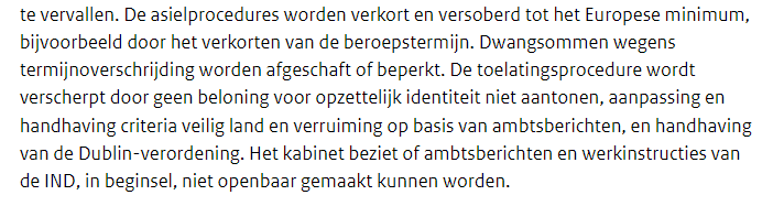 Ook de IND krijgt het makkelijker. De bewijslast wordt zoveel mogelijk bij de vluchteling gelegd, die vervolgens geen recht meer heeft op juridische bijstand. Ook mag de IND haar ambtsberichten en werkwijzen geheim houden. Ook hoeven ze geen dwangsommen meer te betalen.