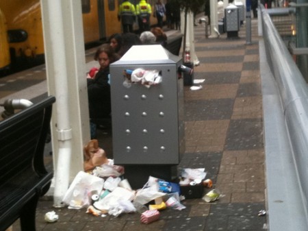 Direct na onze oproep om foto’s van de rommel op stations en in treinen ontvingen we van Dirk Kloosterboer al opvallend materiaal dat laat zien dat schoonmaakbedrijf CSU gewoon doorwerkt op station Amsterdam Amstel. De eerste twee foto’s zijn van zondag 28 februari 2010, de andere twee van vandaag, maandag 1 maart. En dan nog een actiemogelijkheid voor sympathisanten. Wil je de stakers steunen? Stuur dan een kant-en-klare E-card naar Anton Witte, de onderhandelaar namens de bazen.
