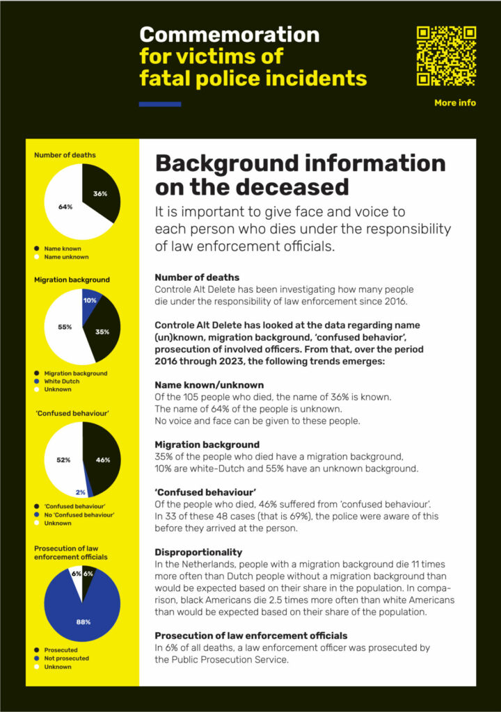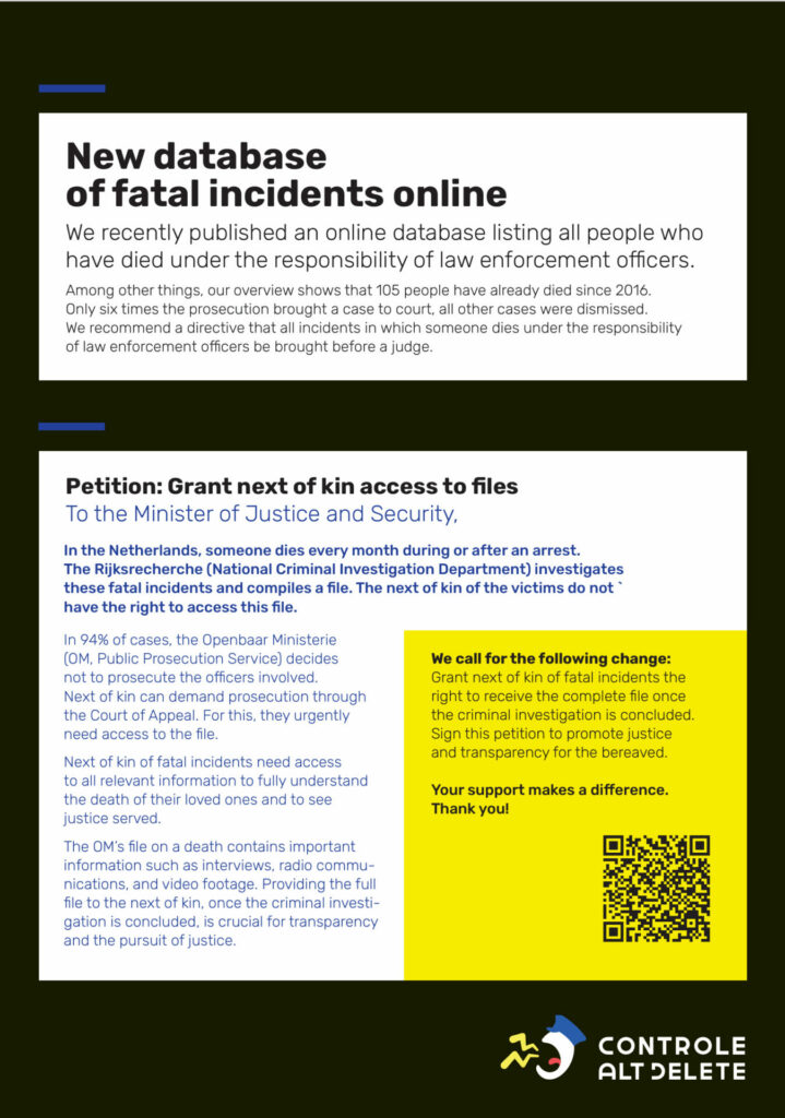 Uit de toelichting op de petitie: “In de periode januari 2016 tot juli 2024 zijn 109 mensen overleden bij of na een aanhouding. Dat zijn gemiddeld 13 slachtoffers per jaar. Een overzicht van alle slachtoffers sinds 2016 is hier te vinden. Controle Alt Delete biedt ondersteuning aan nabestaanden van mensen die overlijden bij of na een aanhouding. Deze petitie is opgesteld in samenwerking met de nabestaanden met wie Controle Alt Delete in contact staat en wordt ondersteund door Slachtofferhulp Nederland en Ypsilon.
