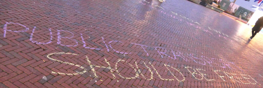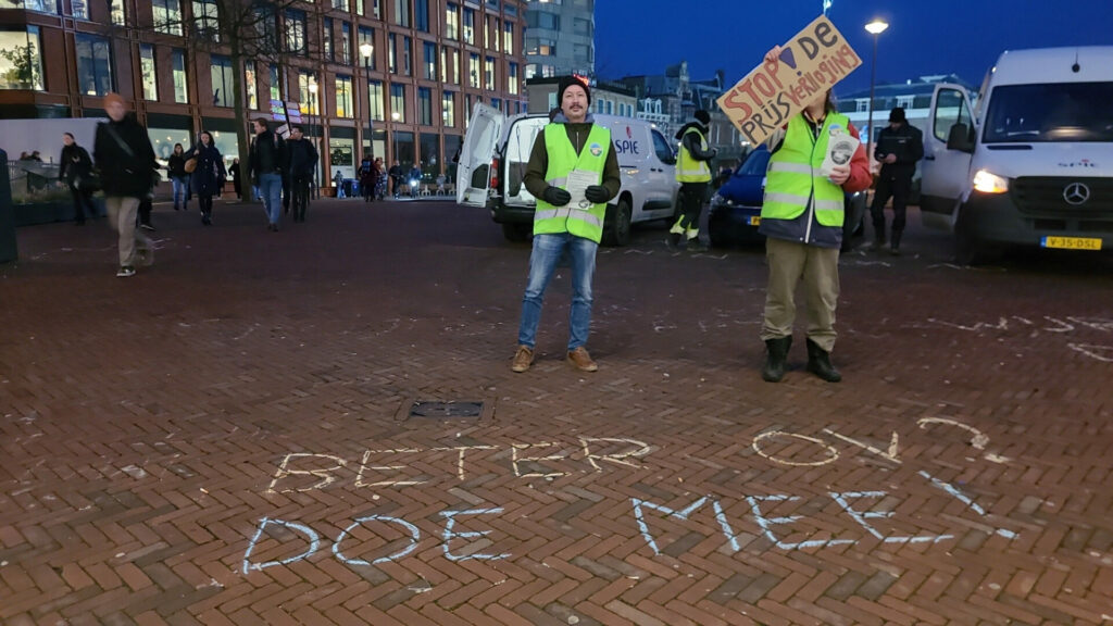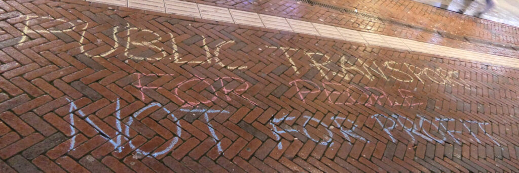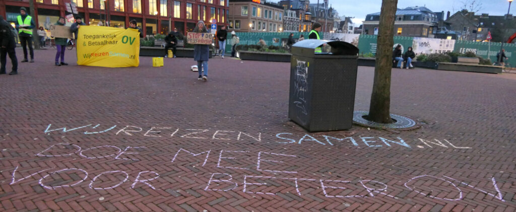 Op donderdag 9 januari deden tijdens de ochtendspits tussen 7:30 en 8:30 uur negen WRS-activisten mee aan de actie. Deze keer werden er wat minder leuzen op het plein gekrijt, mede omdat een hoogwerker en wat busjes na enige tijd het plein gingen bezetten en een deel van de stationsingang zelfs werd afgezet met rood-witte linten. Toch deelden we ook nu weer flink wat flyers uit en kwamen er ook weer gesprekjes op gang met reizigers. “Mijn baas betaalt mijn reiskosten”, liet iemand opgewekt weten. Studenten vertelden dat ze doordeweeks al gratis konden reizen. Maar dat geldt niet voor internationale studenten. En als de studenten die nu nog gratis kunnen reizen eenmaal zijn afgestudeerd, dan zullen ze behoorlijk schrikken van de kosten van het openbaar vervoer. Daar komt bij dat het OV ook in andere opzichten fors aan het verslechteren is. Meer marktwerking, hogere werkdruk voor OV-werkers, minder buslijnen in dorpen en aan de rand van steden, en helaas ook nog de vele vertragingen, omleidingen, defecte bovenleidingen, defecte treinen, wisselstoringen, overvolle trams, bussen en treinen, en fysiek slecht toegankelijk OV voor mensen met een beperking. Tijdens de actie gingen veel duimen omhoog van reizigers die het eens waren met het streven naar een toegankelijk, betaalbaar en bereikbaar OV. De WRS-campagne kan rekenen op een potentieel grote achterban.