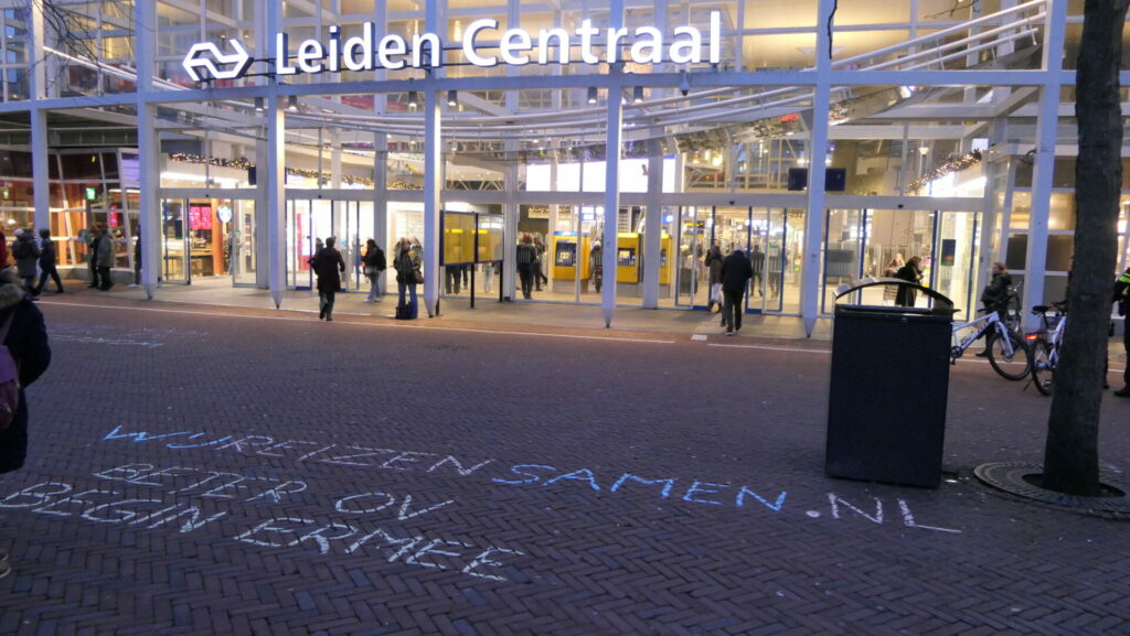 Op 7 en 9 januari hebben mensen van de Leidse groep van de landelijke campagne Wij Reizen Samen (WRS) op het plein voor station Leiden Centraal zo’n 400 flyers uitgedeeld aan reizigers. Met krijt werd het plein bovendien voorzien van flink wat leuzen. De aanleiding voor de twee flyer- en krijtacties vormden de prijsstijgingen in het openbaar vervoer die per 1 januari zijn ingegaan. Met een spandoek, actieborden en WRS-hesjes wisten de activisten behoorlijk veel aandacht te trekken van reizigers die het station in- en uitliepen.