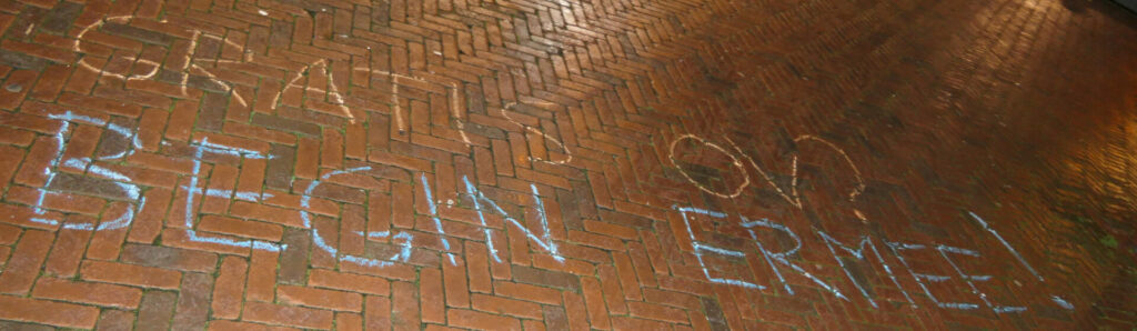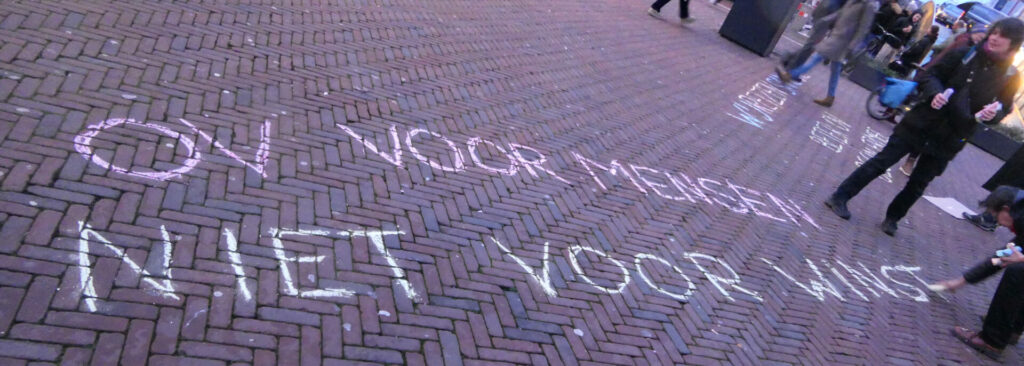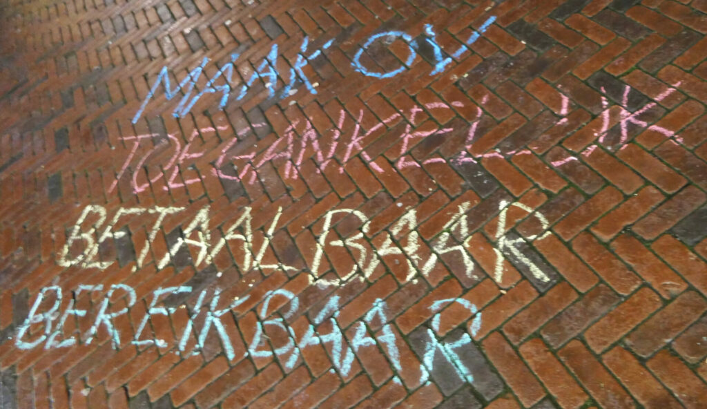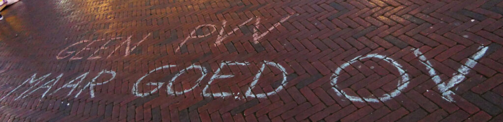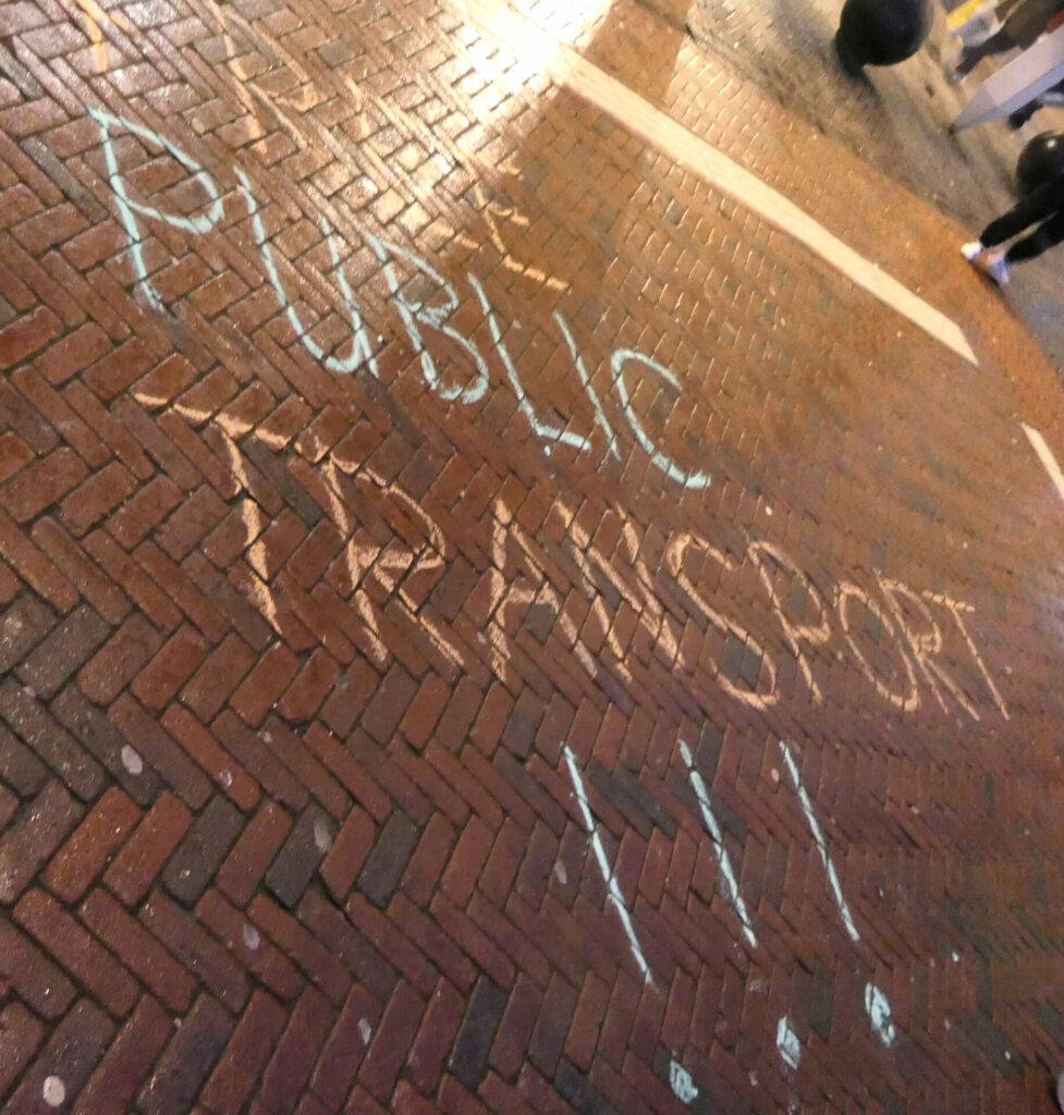 Op dinsdag 7 januari deden tijdens de avondspits tussen 17:00 en 18:00 uur twaalf mensen van Wij Reizen Samen mee aan de actie. Zo´n tien leuzen werden op het plein gekrijt. Bij aanvang kwam meteen de politie langs. Men liet ons weten dat men al op de hoogte was van de actie. We hadden de beide flyeracties niet aangemeld bij de politie, maar wel publiekelijk aangekondigd. De politie leek het allemaal wel best te vinden en deed er niet moeilijk over dat we hen niet vooraf op de hoogte hadden gebracht. Sterker nog, ze zeiden daar geen woord over. Dat werkt uiteraard stimulerend voor activisten die liever spontaan demonstreren, in plaats van meteen al bij aanmelding te maken te krijgen met beperkingen die de politie wil opleggen aan het demonstratierecht.