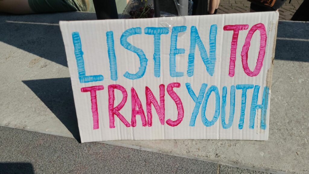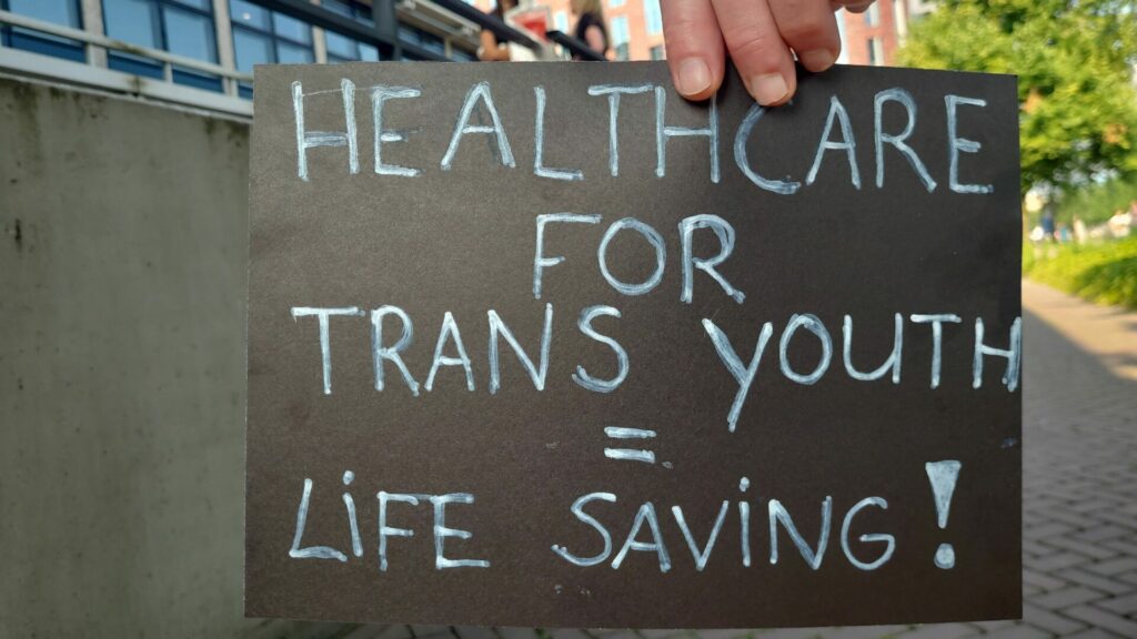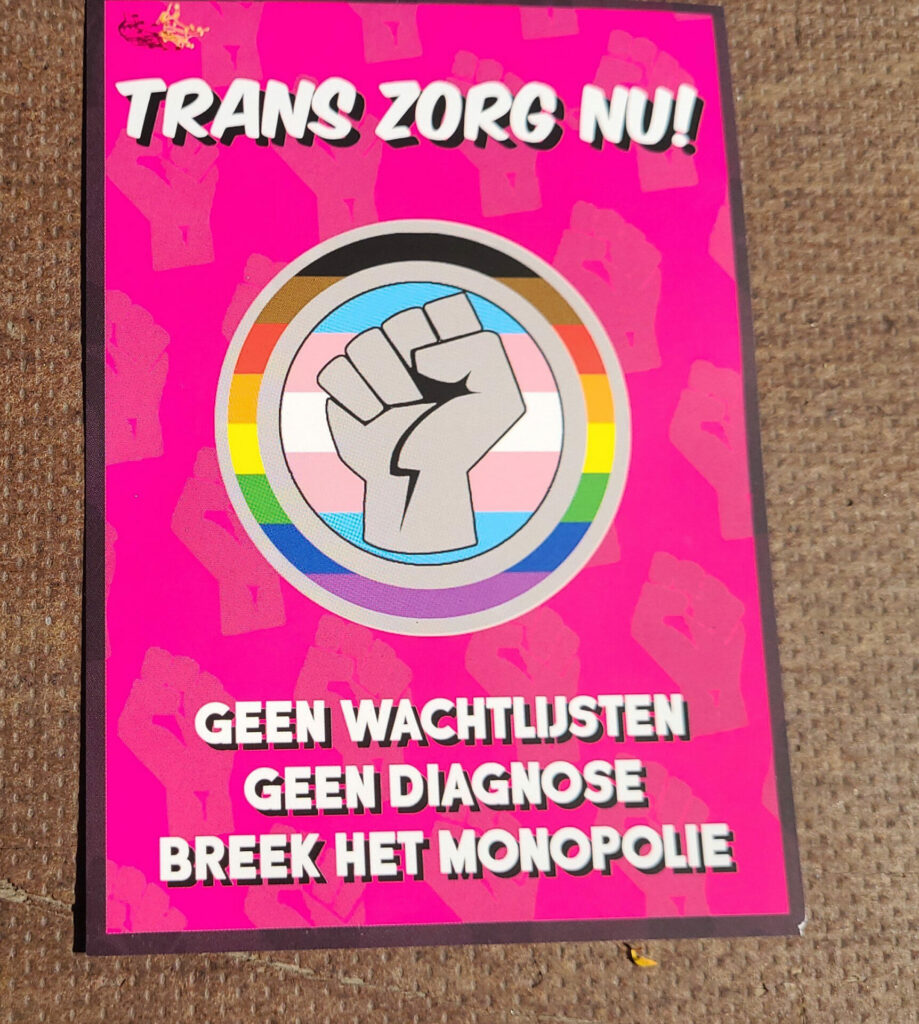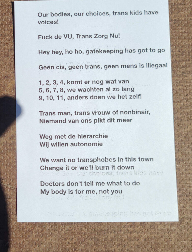 Die eis van zelfbeschikking voor trans mensen klonk door de hele actie heen. Dat bleek niet alleen uit de toespraken, maar ook uit de leuzen die werden geroepen en die op een flyertje stonden vermeld. Zoals: “Our bodies, our choices, trans kids have voices!”, “Hey hey, ho ho, gatekeeping has to go!”, “Weg met de hiërarchie, wij willen autonomie!” en “1, 2, 3, 4, komt er nog wat van, 5, 6, 7, 8, we wachten al zo lang, 9, 10, 11, anders doen we het zelf!” en “Doctors don’t tell me what to do, my body is for me, not you!”.