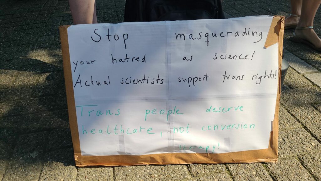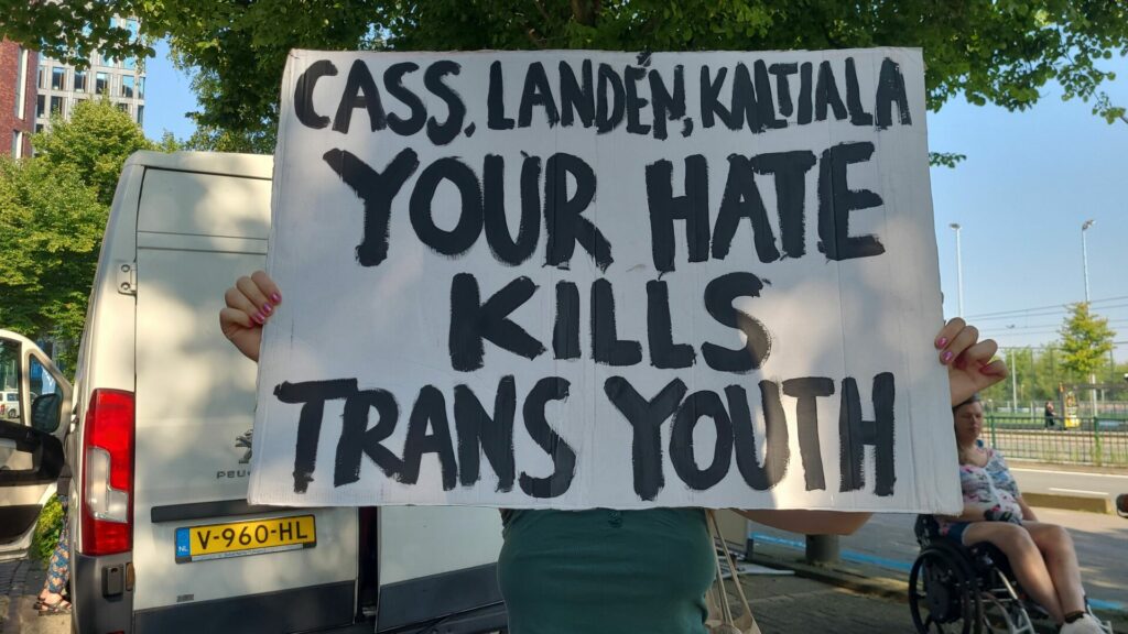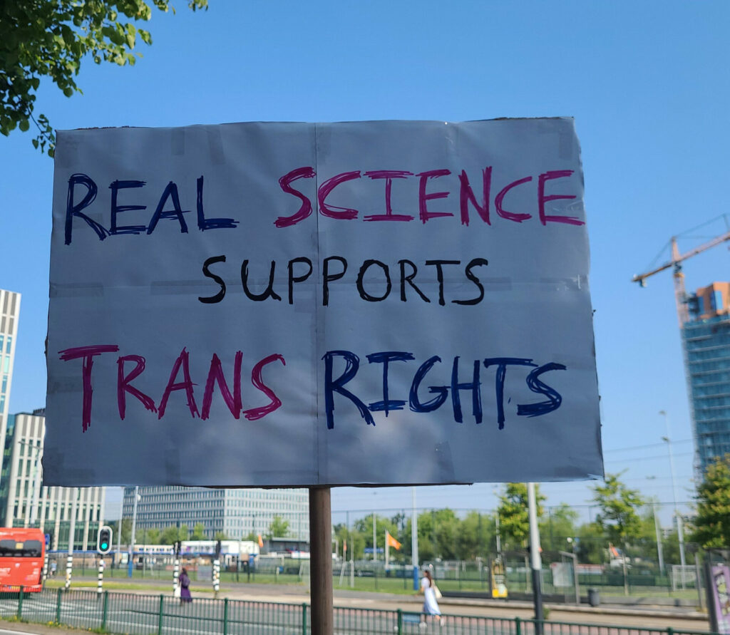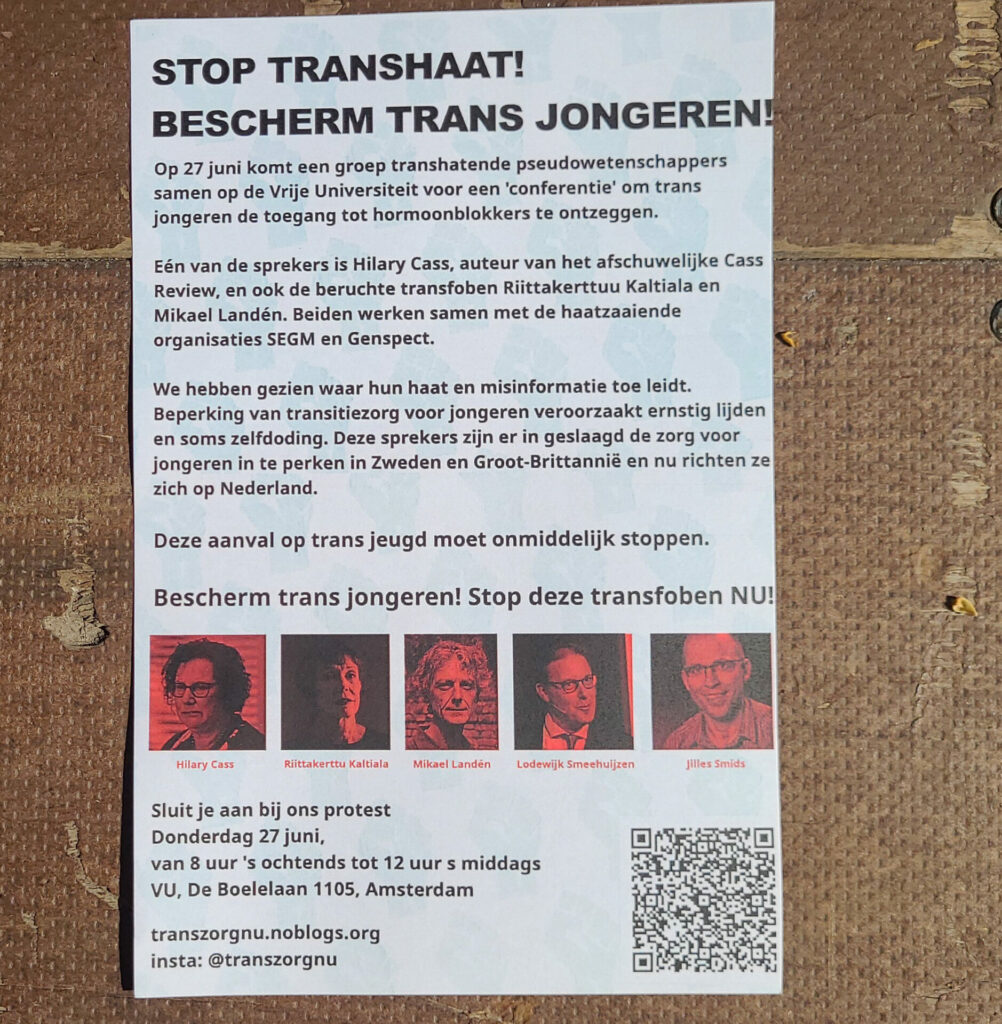 Zo’n 60 mensen, voornamelijk trans en andere queer activisten, deden gisterochtend mee aan een strijdbare protestactie tegen een conferentie die op hetzelfde moment op de Vrije Universiteit (VU) in Amsterdam plaatsvond. Een groep transhatende pseudowetenschappers kwam daar bijeen om trans jongeren de toegang tot hormoonblokkers te ontzeggen. “Een van de sprekers is Hilary Cass, auteur van het afschuwelijke ‘Cass Report’, en ook de beruchte transfoben Riitakertuu Kaltiala en Mikael Landén. Beiden werken samen met de haatzaaiende organisaties SEGM en Genspect”, aldus Trans Zorg Nu!, die de actie had georganiseerd.