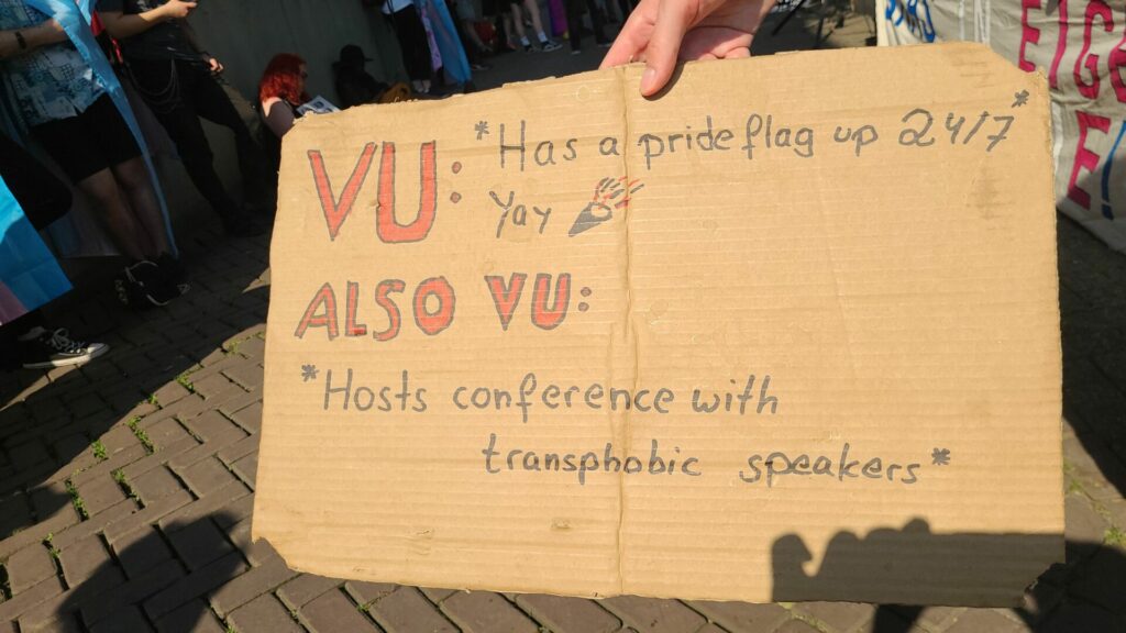 Strijdbare protestactie tegen transhaat op de Vrije Universiteit: “Fuck de VU, trans zorg nu!” (beeldverslag)