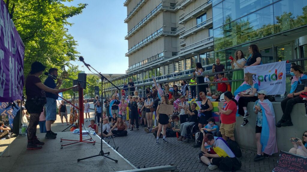 Het protest werd passend afgesloten met een hels kabaal om de transhatende pseudowetenschappers te laten horen dat trans mensen er zijn en dat ze blijven strijden voor zelfbeschikking en tegen paternalistisch en hiërarchisch ingestelde medici en andere zorgverleners. Het was voor alle deelnemers aan de actie duidelijk dat het hoog tijd is voor solidariteit met en tussen alle gemarginaliseerde groepen in de samenleving die gestigmatiseerd, gecriminaliseerd en gedehumaniseerd worden door de fascisten die tot in de kern van het staatsapparaat zijn doorgedrongen.