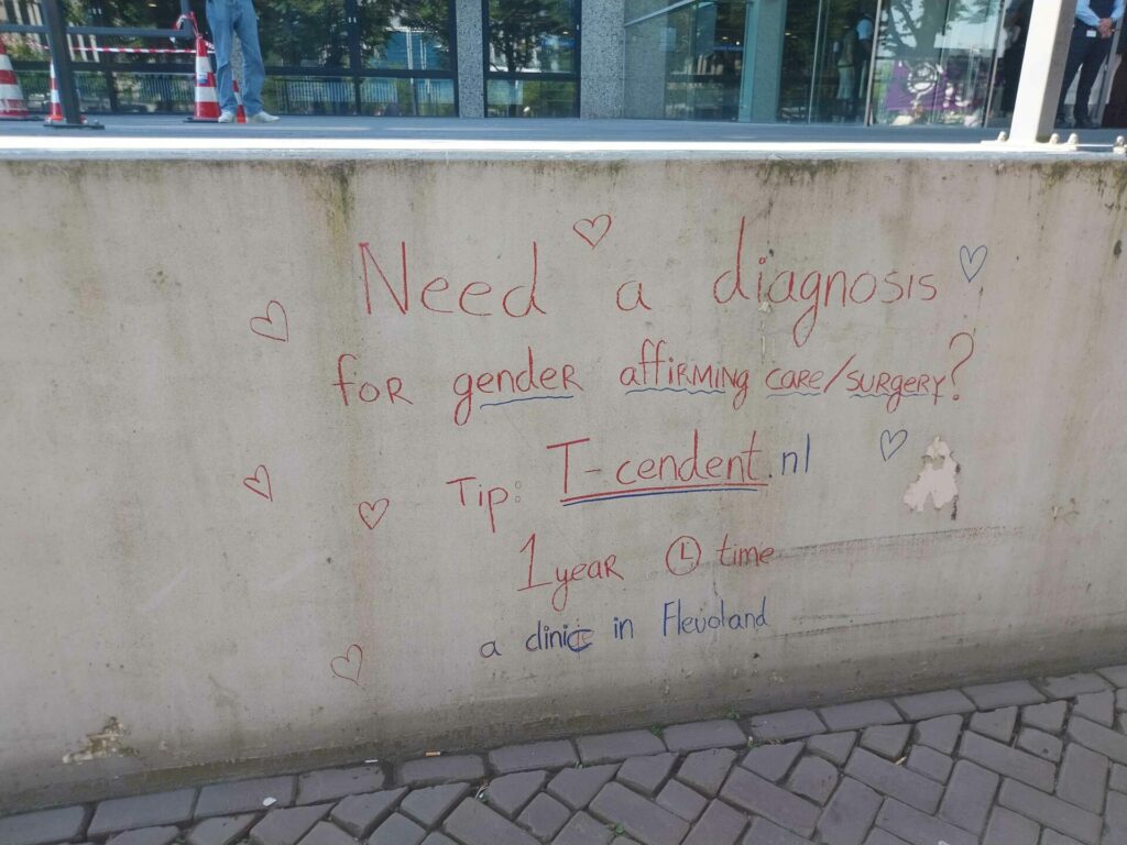 Voortdurend werden de transhaters in de VU op de korrel genomen. “We hebben gezien waar hun haat en misinformatie toe leidt”, stond er op een andere flyer die werd uitgedeeld. “Beperking van transitiezorg voor jongeren veroorzaakt ernstig lijden en soms zelfdoding. Deze sprekers zijn er in geslaagd de zorg voor jongeren in te perken in Zweden en Groot-Brittannië en nu richten ze zich op Nederland.” Daar werd tijdens de actie aan toegevoegd dat het geen toeval is dat dit soort conferenties momenteel worden gehouden. Want er is een extreem-rechtse regering aan de macht gekomen en die wil transhaters ongetwijfeld ruim baan – en geld – geven en transitiezorg afbreken. De leuze “Fuck de VU, trans zorg nu!” viel dan ook herhaaldelijk te horen.