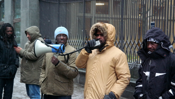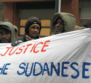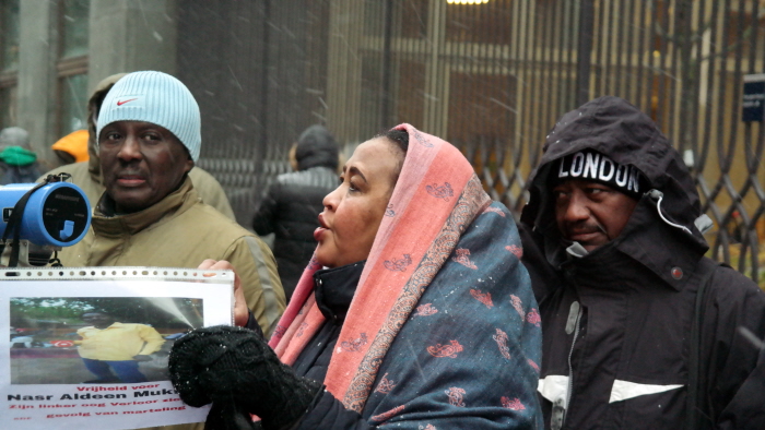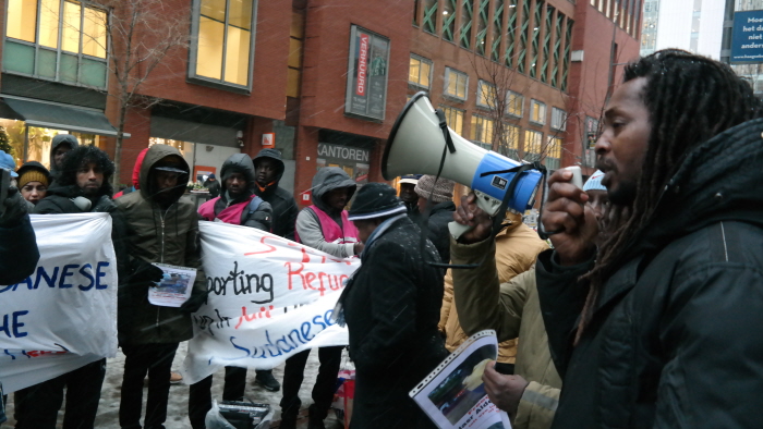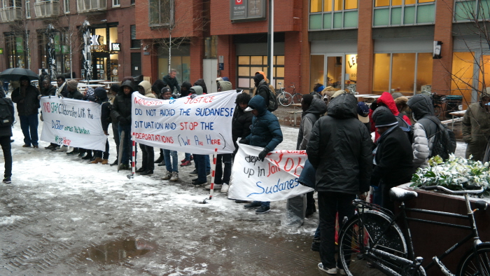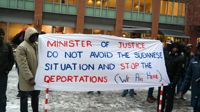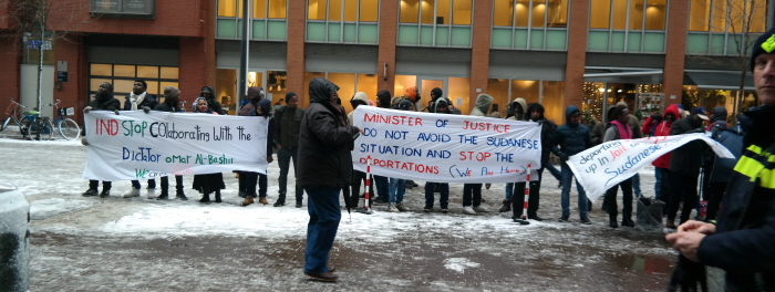Vanmiddag demonstreerden in Den Haag zo’n vijftig mensen, voornamelijk Soedanese vluchtelingen en ook enkele witte Nederlanders, tegen de dreigende deportatie van vluchtelingen naar Soedan. De actie vond buiten in de sneeuwstorm plaats, voor de ingang van het ministerie van Veiligheid en Justitie, en was georganiseerd door We Are Here, Darfur Union, Democratic Member, Umma Partij, Sudanese Democratic Forum en Nuba Mountains Solidarity Abroad.