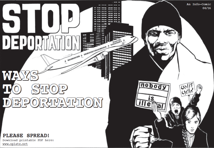 The comic contains useful and important information for people under threat of deportation, but also for people supporting them. Spread it and share the link in your social networks! Anyone can print and distribute copies anywhere in Germany. It would be cool if all local initiatives could organize the printing and distribution in their areas. You can download the files for printing.