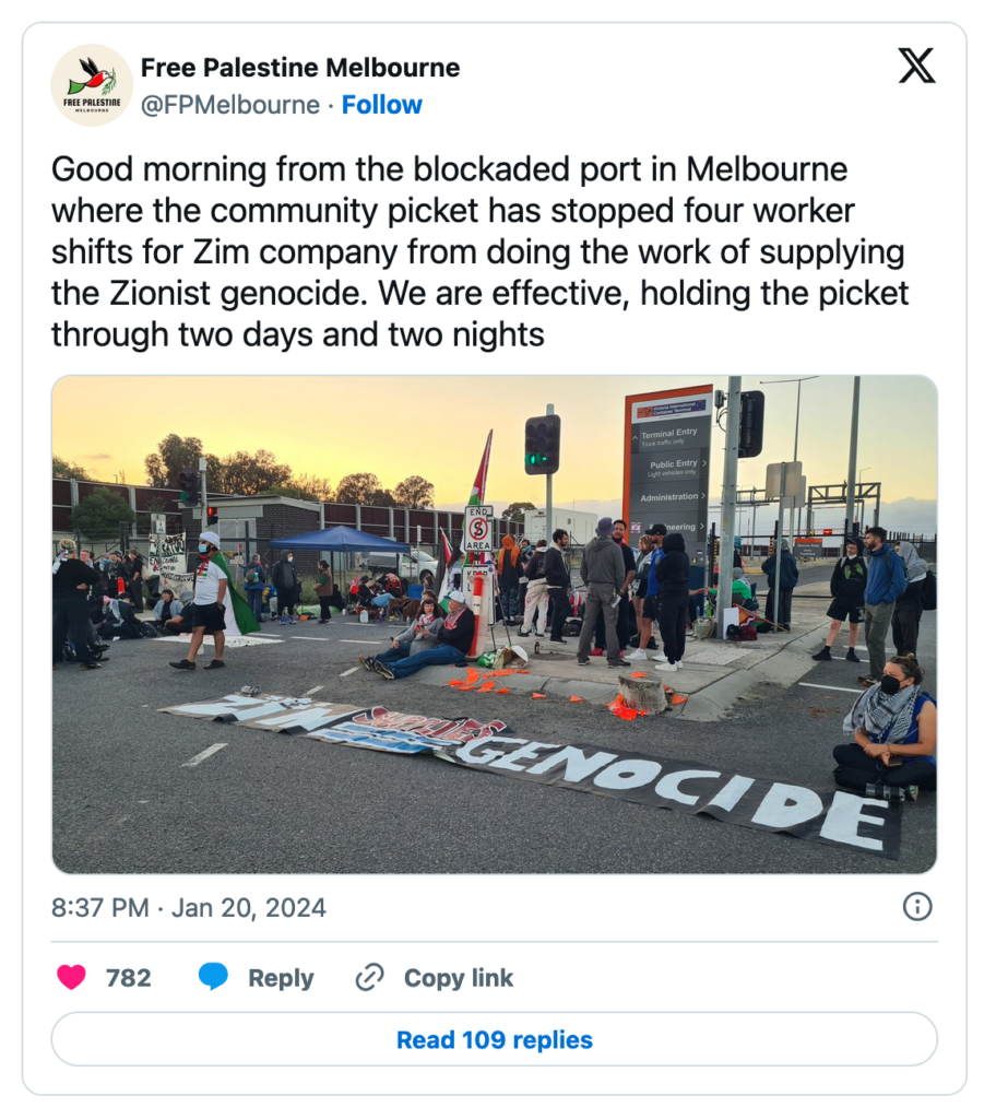 In Australië lukte het anti-genocide activisten een schip van het Israëlische bedrijf dagen oponthoud te bezorgen door te voorkomen dat het kon aanleggen in de haven van Melbourne. “De actie heeft de haven volledig geblokkeerd (…) om een krachtige boodschap naar de regering te sturen dat de inwoners van Melbourne niet blij zijn met het laden van ZIM-schepen”, vertelde protestorganisator Mohammed Helmy aan Middle East Eye. De actie werd bijgestaan door een groep kayaktivists – activisten die in kajakken het water opgaan om te blokkeren.