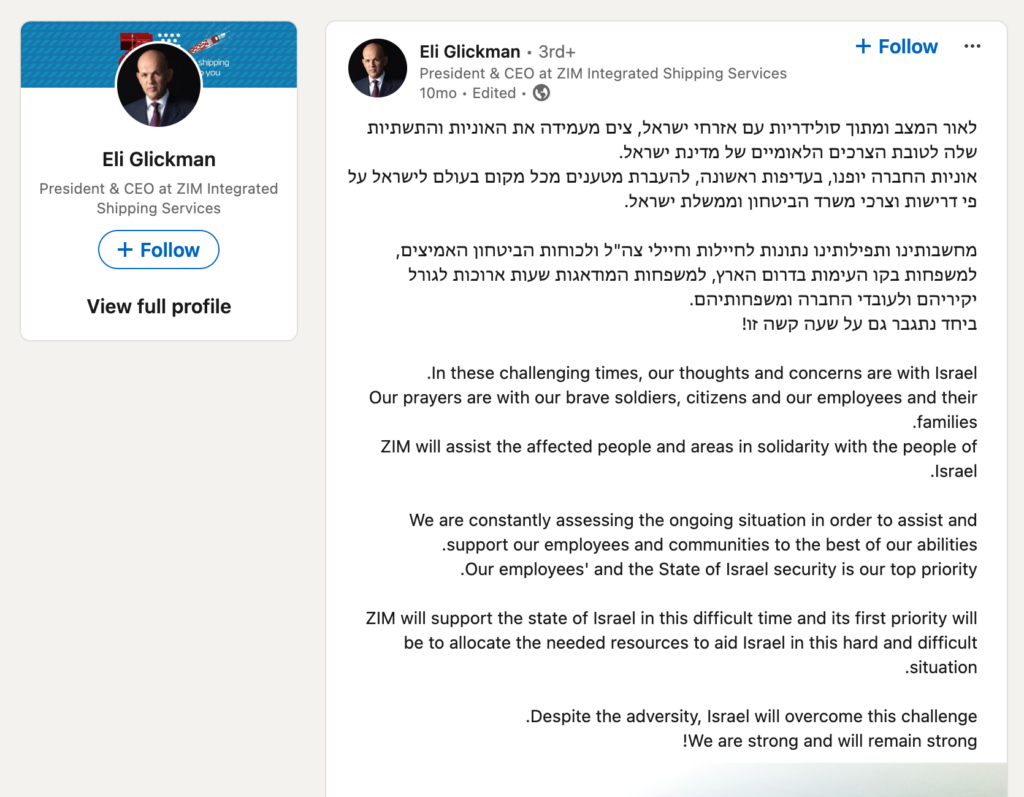 Deze diverse protesten werden georganiseerd nadat ZIM Integrated Shipping Services in oktober 2023 had aangekondigd dat ze Israël al hun schepen en infrastructuur aanbieden, met de belofte in de behoeften van de natie te voorzien. De CEO van ZIM, Eli Glickman, plaatste persoonlijk diverse posts op Twitter.