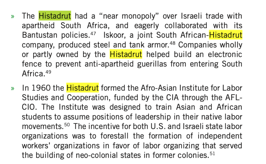 Het bedrijf heeft echter al vanaf de oprichting een problematisch karakter. Op de website van ZIM shipping staat: “ZIM werd in 1945 opgericht door het Joods Agentschap, de Histadrut-arbeidersfederatie en de Israel Maritime League’”. Bij mij ging er een belletje rinkelen. Heb ik die Histadrut niet voorbij zien komen in een zine van 2012 van het International Jewish Anti-Zionist Netwerk? Zaten zij niet achter apartheid-ellende in Zuid-Afrika en hadden zij niet een cruciale rol in het creëren van de koloniale apartheidsstaat Israël? Hoe zit dat?