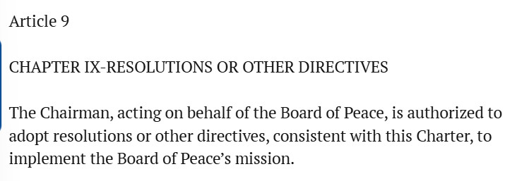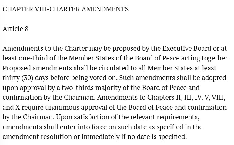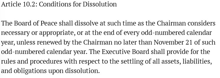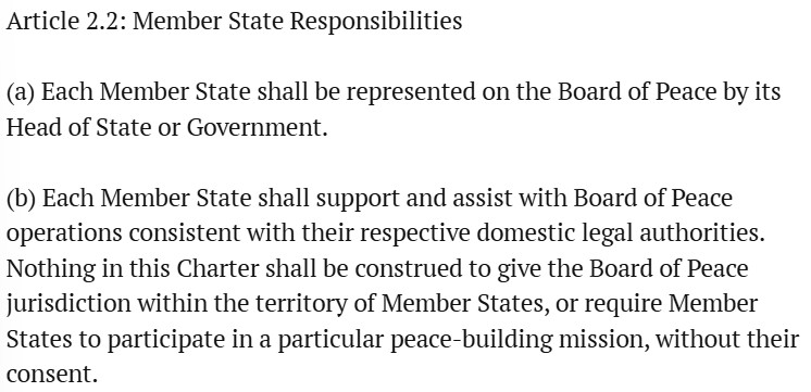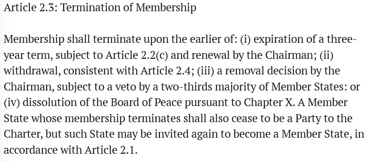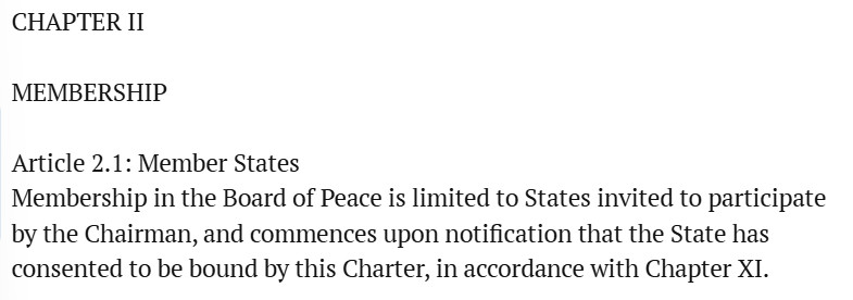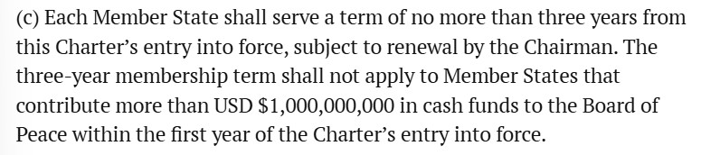 Dan hoofdstuk 2: wie mag er lid worden van de ‘Vredesraad’? Landen moeten door de voorzitter worden uitgenodigd voor lidmaatschap. Het lidmaatschap duurt drie jaar, en kan telkens worden hernieuwd door een besluit van de voorzitter. Tenzij een land 1 miljard dollar aftikt, natuurlijk.