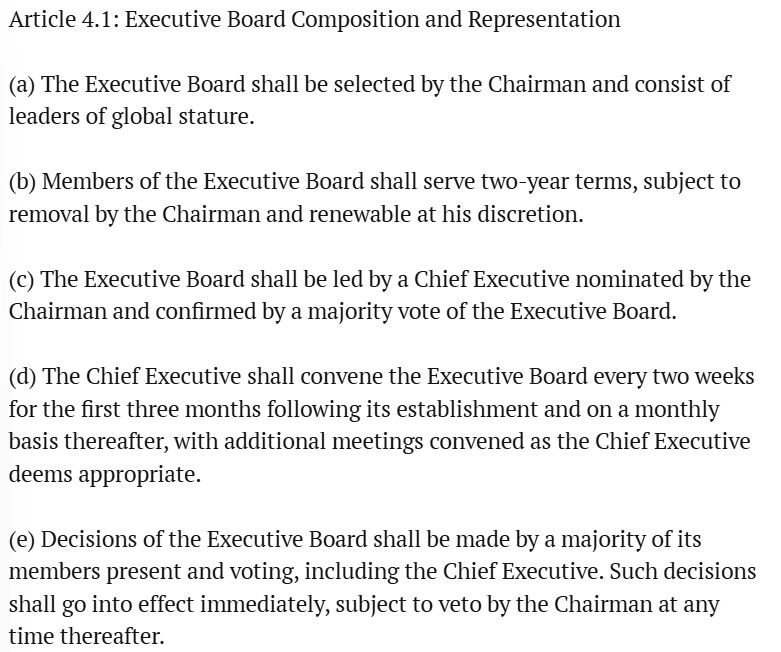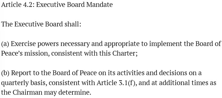 Dan nog even over de Uitvoerende Raad: die heeft de dagelijkse leiding over de ‘Vredesraad’. Zij mogen alle gedetailleerde besluiten nemen binnen de ‘Vredesraad’. En jawel, zij worden eenzijdig benoemd en ontslagen door de voorzitter. Alle besluiten moeten worden goedgekeurd door de voorzitter.